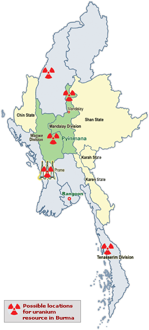 In the early 2000s, the regime confirmed publicly that uranium deposits had been found in five areas: Magwe, Taungdwingyi, Kyaukphygon and Paongpyin in Mogok, and Kyauksin. Residents of Thabeikkyin township, 60 miles north of Mandalay, said searches were underway in the area. The searches also extended to southern Tenasserim Division.